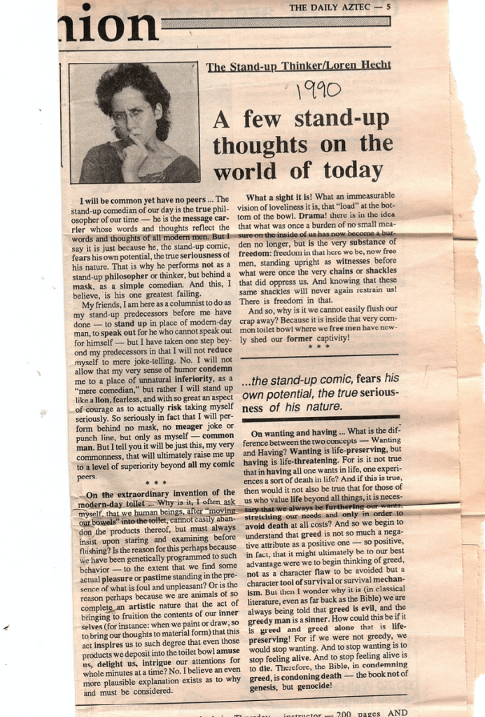 A Few Standup Thoughts [from 1990, Aztec Newspaper, San Diego] microobservations Uncategorized December 30, 2021 1 Minute Share this: Click to share on X (Opens in new window) X Click to share on Facebook (Opens in new window) Facebook Like Loading... Related Published by microobservations View all posts by microobservations Published December 30, 2021
