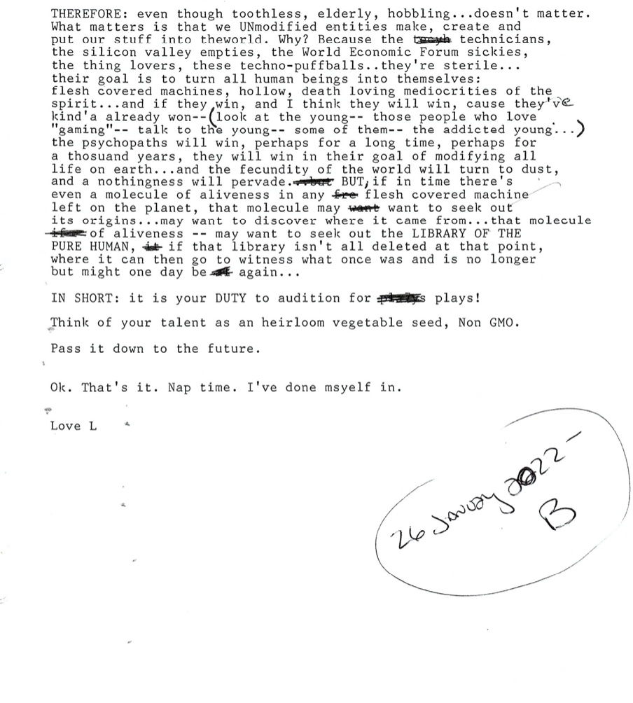 MY MESSY, somewhat edited Letter to a Friend who- in her text to me said– after asking how I was– that she feared going to a theatre audition cause she was toothless and elderly, thus “imperfect”. 26 January 2022