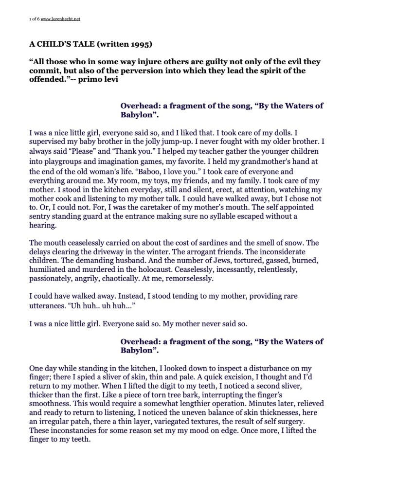 A CHILD’S TALE (“All those who in some way injure others are guilty not only of the evil they commit, but also of the perversion into which they lead the spirit of the offended.”– Primo Levi)