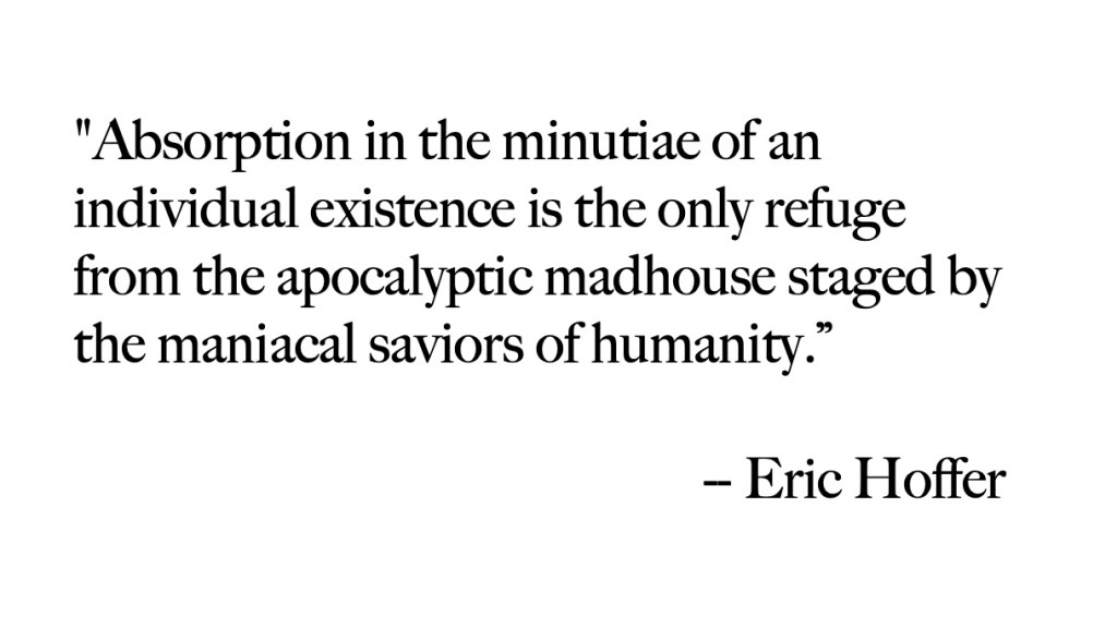 "Absorption in the minutiae of an individual existence is the only refuge from the apocalyptic madhouse staged by the maniacal saviors of humanity."– Eric Hoffer